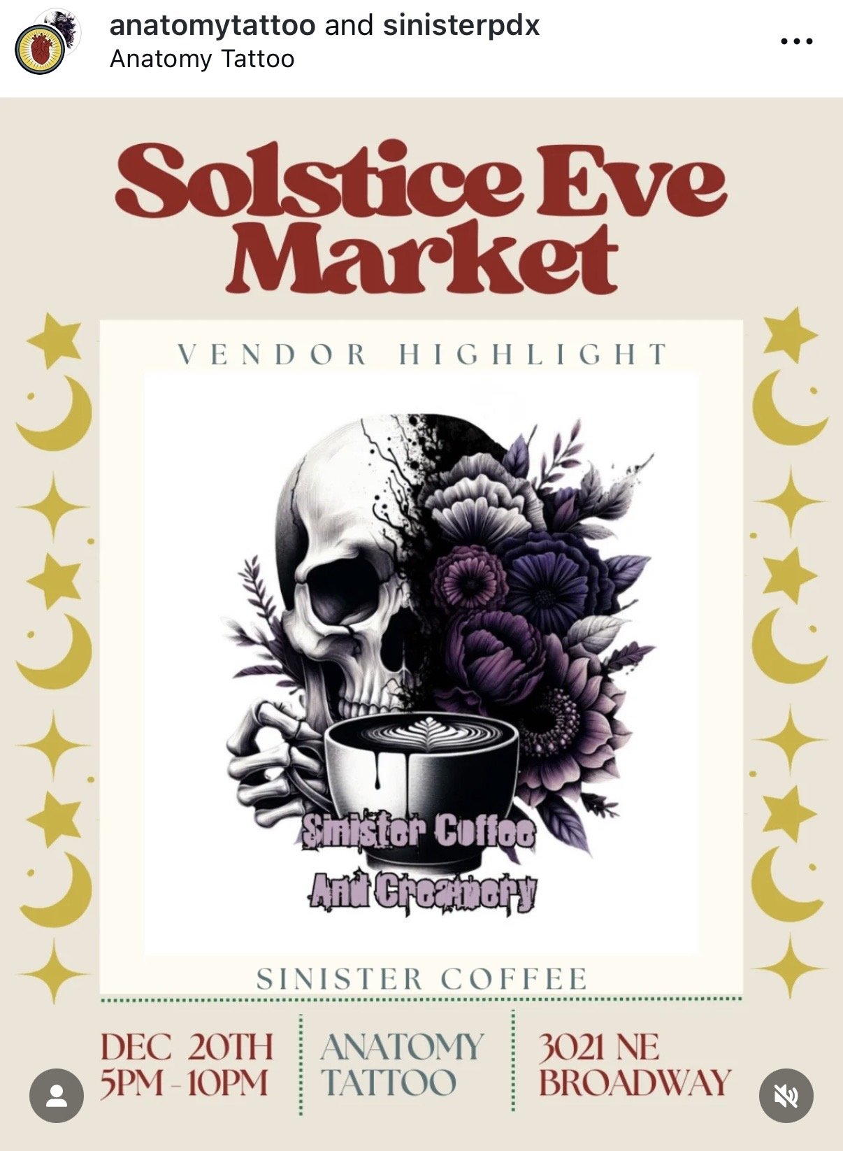We’re thrilled to announce that Sinister Coffee & Creamery will be featured as a vendor at the Solstice Eve Market, hosted by Anatomy Tattoo, on Friday, December 20th from 5–10 PM at 3021 NE Broadway.